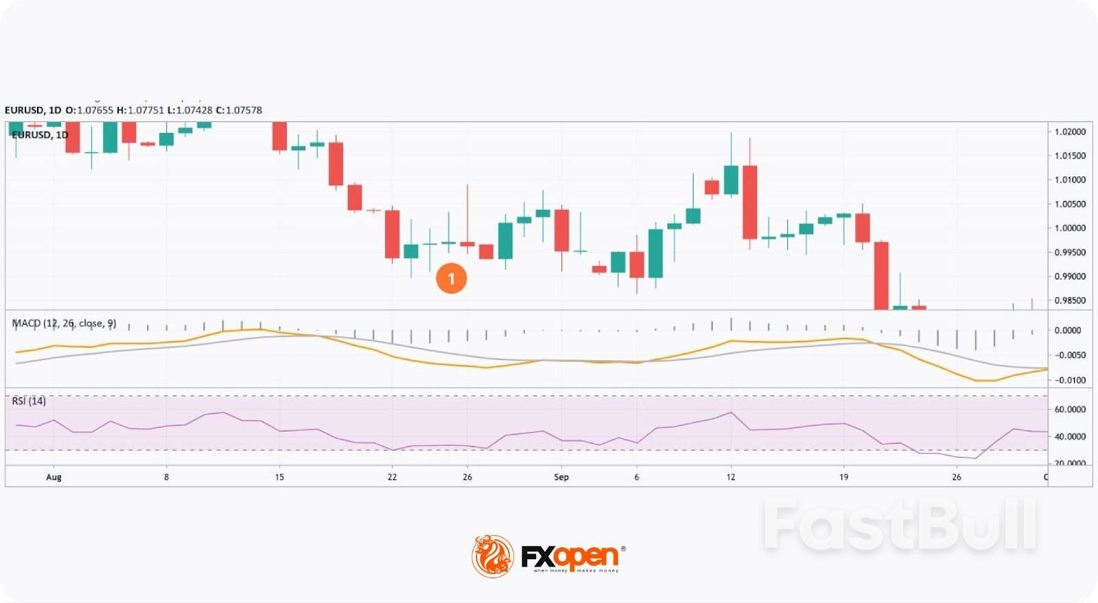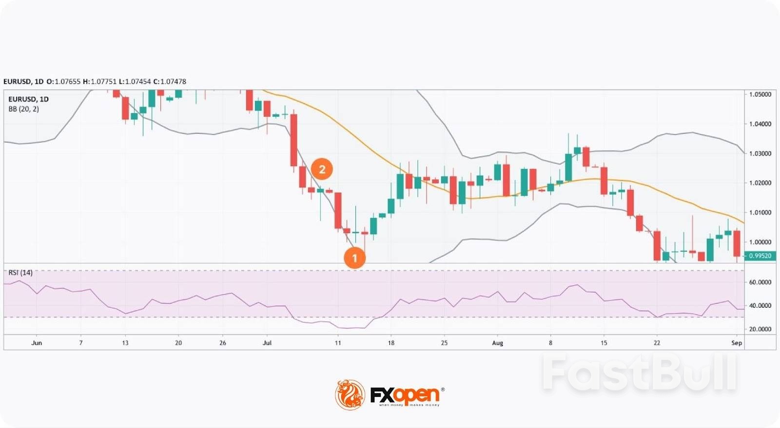 في الرسم البياني أعلاه، شكّل زوج يورو/دولار أمريكي قمة دوارة وشمعتين دوجي، شاهد قبر ويعسوب، في نهاية اتجاه هبوطي (1). في ذلك الوقت، كان مؤشر القوة النسبية في منطقة ذروة البيع، وكان الزوج قريبًا من النطاق السفلي لمؤشر بولينجر باند. بعد ذلك، انعكس اتجاه السوق.