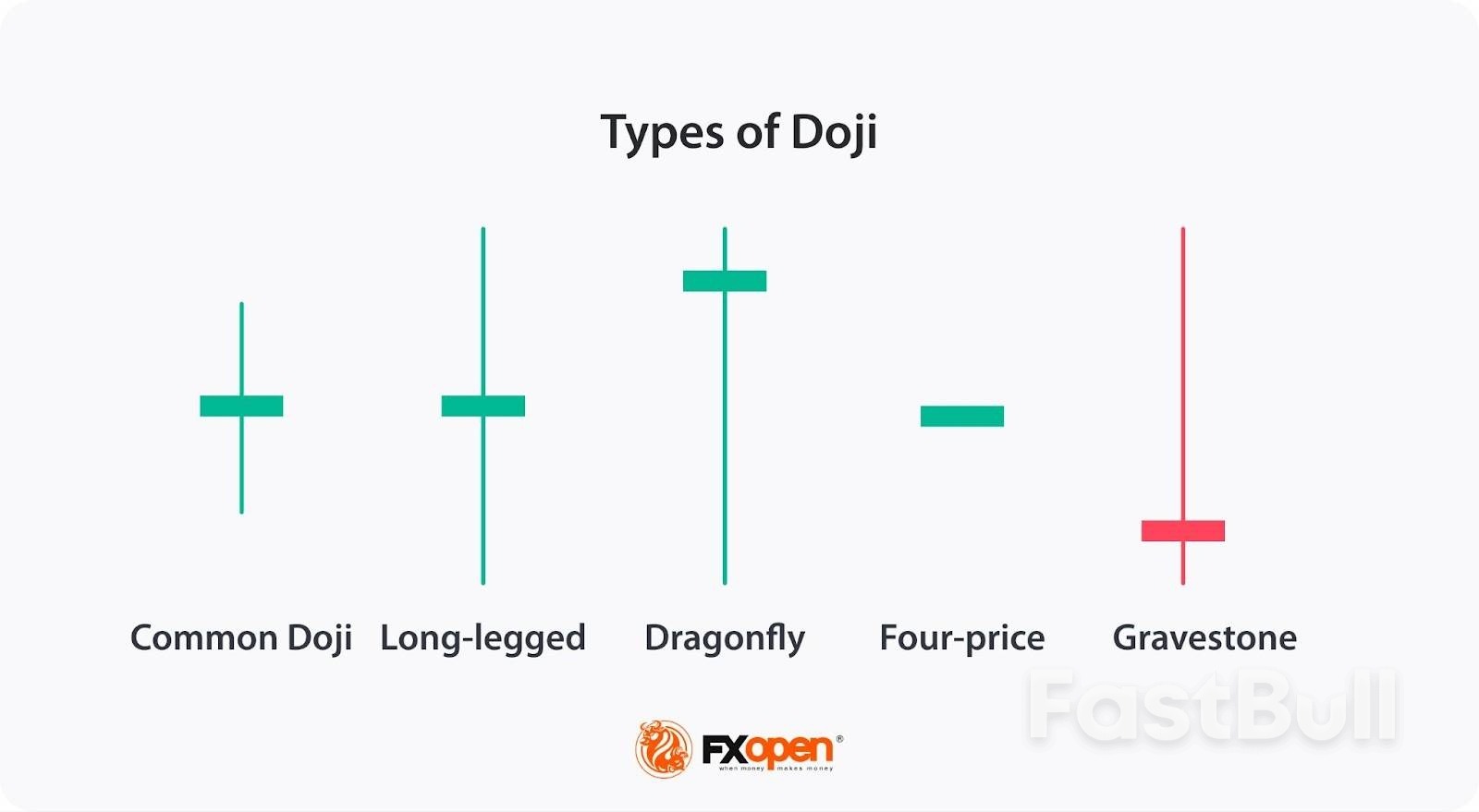 أكثر أنواع شموع دوجي شيوعًا هي الشموع القياسية، والشموع ذات الأرجل الطويلة، وشموع اليعسوب، وشموع شاهد القبر، وشموع الأربعة أسعار.