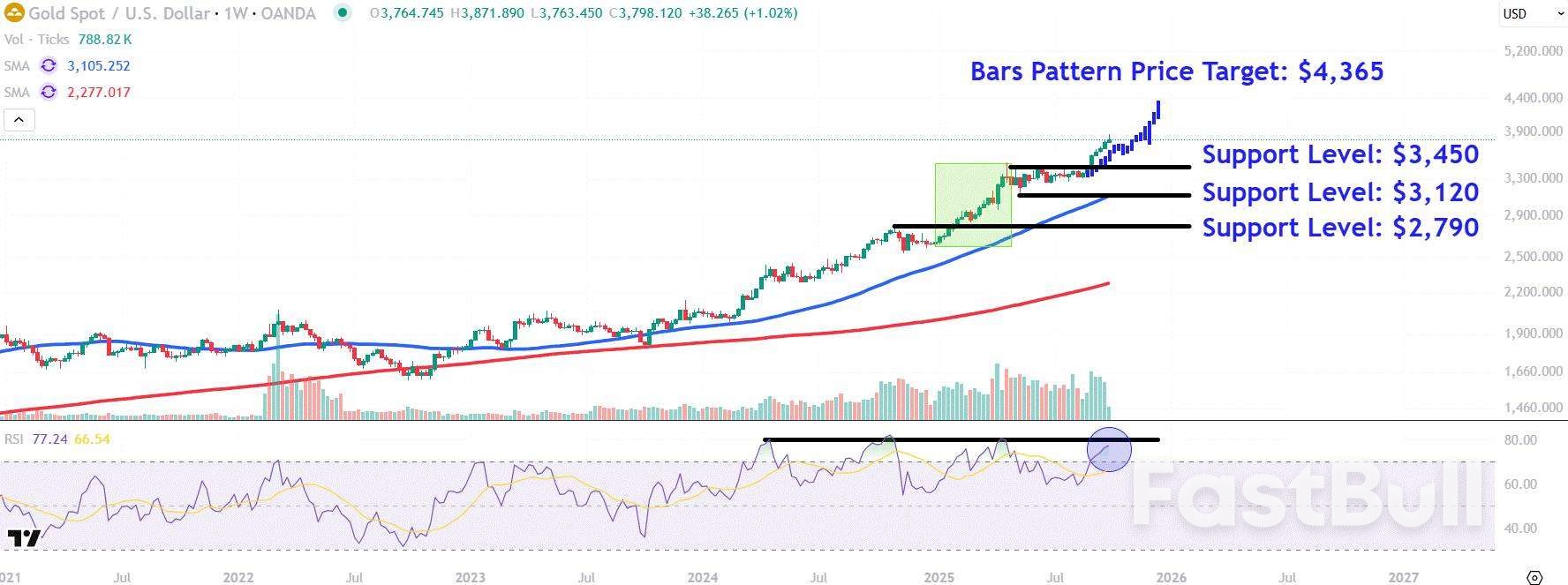 عند تطبيق التحليل، نأخذ الحركة القوية التي شهدها المعدن النفيس من أوائل يناير إلى أواخر أبريل، ونطبقها على بداية الاتجاه الصعودي الحالي. هذا يُشير إلى هدف يبلغ حوالي 4,365 دولارًا أمريكيًا، ما يعني ارتفاعًا بنسبة 13% تقريبًا عن مستويات تداول يوم الثلاثاء.