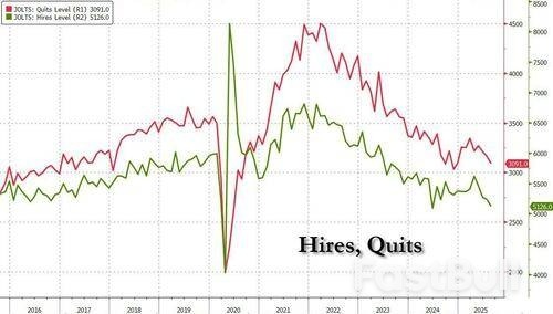Sementara data lowongan pekerjaan buruk dan berpotensi menjadi pertanda pertama resesi mendatang - keadaan di bawah permukaan bahkan lebih buruk lagi, dimulai dengan perekrutan di mana jumlah karyawan baru anjlok 114 ribu menjadi 5,126 juta, terendah sejak Juni 2024, sementara di saat yang sama jumlah orang yang berhenti dari pekerjaan mereka - juga dikenal sebagai indikator ambil pekerjaan ini dan tinggalkan - juga merosot 75 ribu menjadi 3,091 juta, terendah tahun 2025.