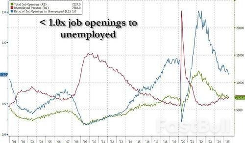 Maju cepat ke hari ini, ketika gambaran pasar tenaga kerja yang sudah buruk menjadi lebih buruk lagi, ketika beberapa saat yang lalu BLS melaporkan laporan JOLT bulan Agustus terbaru (yang mungkin saja menjadi laporan pasar tenaga kerja Federal terakhir untuk waktu yang lama setelah pemerintah tutup pada tengah malam nanti) dan yang menunjukkan bahwa lowongan pekerjaan tetap tertekan, meskipun naik sedikit dari cetakan bulan Juli yang direvisi naik sebesar 7,208 juta (naik dari 7,181 juta), menjadi 7,227 juta, dan mengalahkan estimasi yang diredam sebesar 7,2 juta.