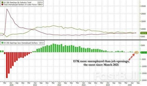 Sebulan yang lalu, sebelum laporan lapangan kerja Agustus yang sangat buruk (dan laporan bulanan negatif pertama dalam beberapa tahun) dan sebelum revisi gaji negatif 911 ribu yang menghancurkan, kami meninjau laporan JOLTS yang baru saja diterbitkan dan dengan tepat memprediksi penurunan suku bunga September (dan juga pelonggaran selanjutnya). Perlu dicatat, laporan tersebut tidak hanya menunjukkan bahwa lowongan pekerjaan anjlok dan berada di bawah perkiraan terendah, tetapi untuk pertama kalinya sejak April 2021, jumlah pengangguran lebih banyak daripada lowongan pekerjaan.