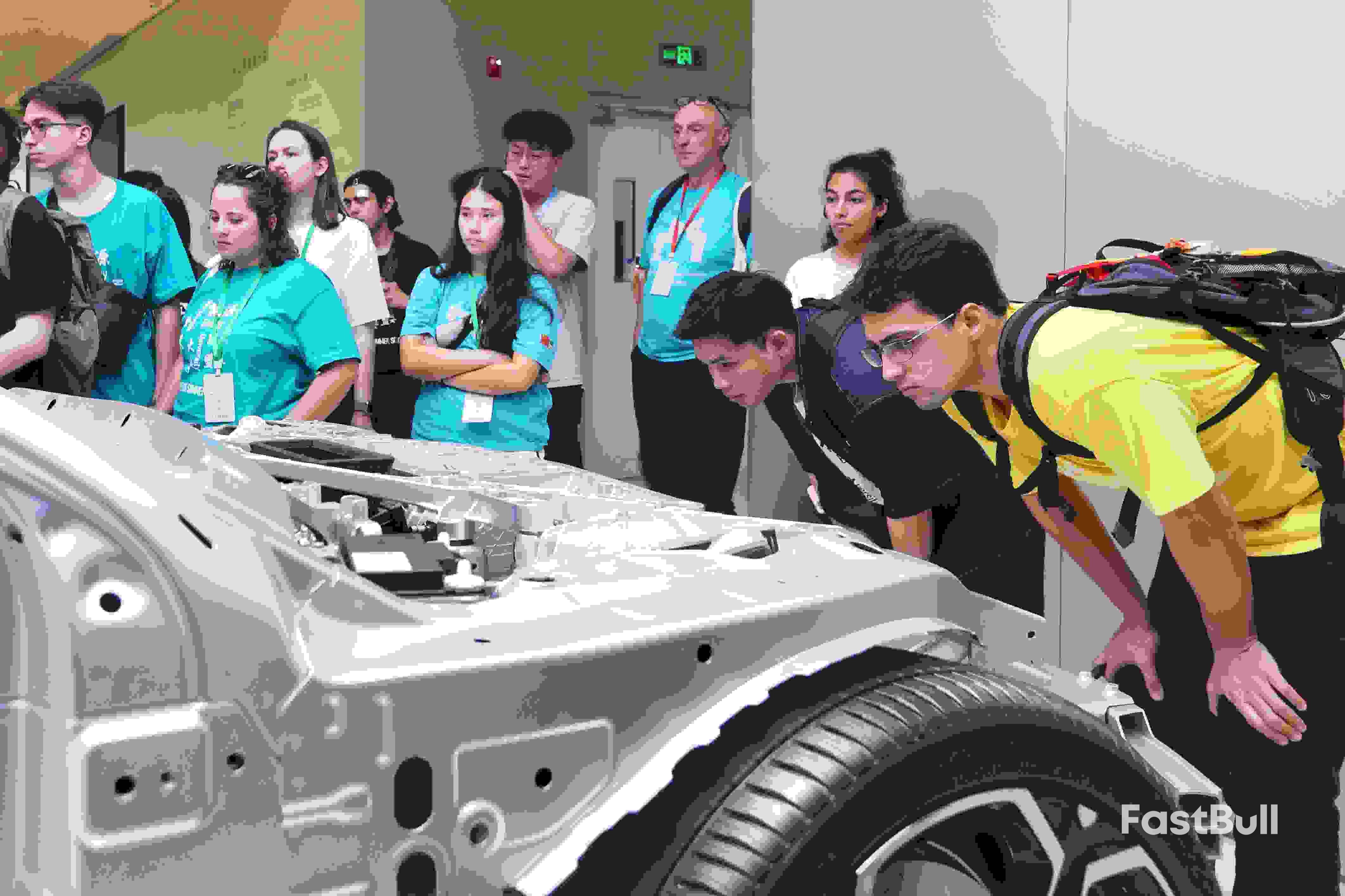 BEIJING, TIONGKOK - 30 JUNI: Mahasiswa asing melihat platform Modena saat mengunjungi Xiaomi Auto Super Factory pada 30 Juni 2025 di Beijing, Tiongkok.
