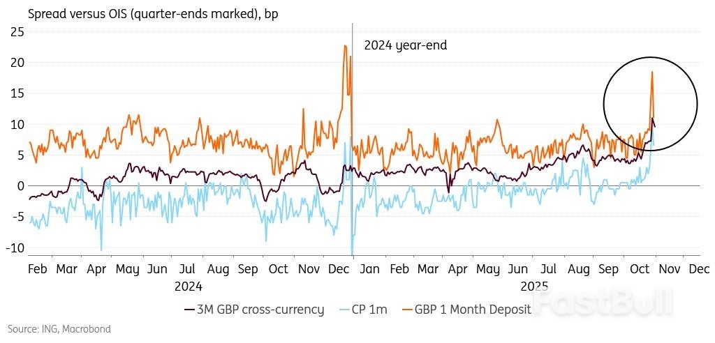 The tightening of money market conditions in October was considerable, but we argue that this was a one-off due to tweaks in the Bank of England liquidity facilities. Overnight repo rates have risen significantly since mid-month, and term deposits, commercial paper and the cross-currency basis also reflected a dash for liquidity. In fact, the spread on short-dated commercial paper peaked above 2024 year-end levels.