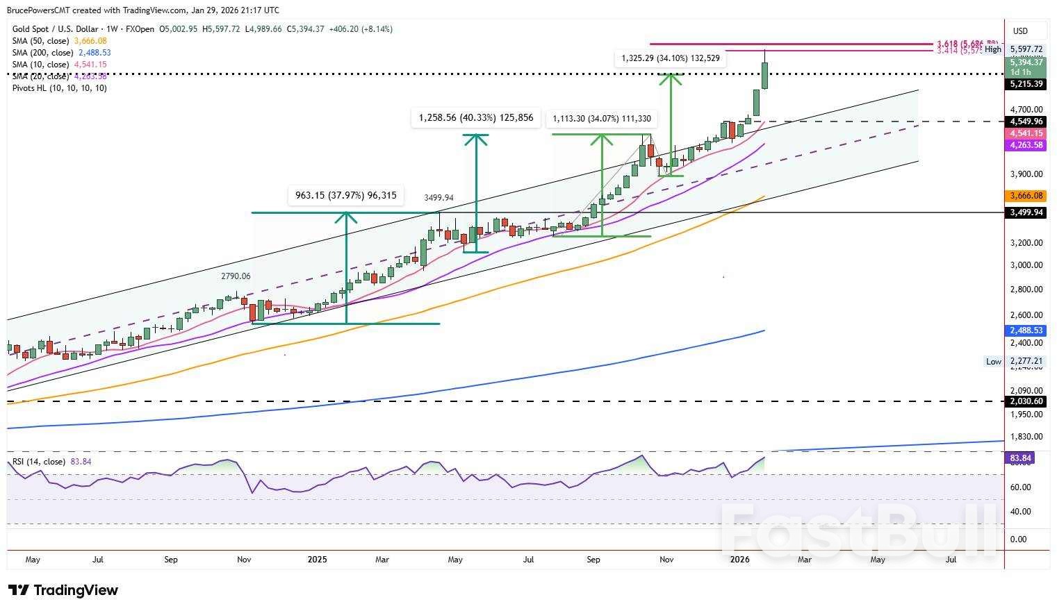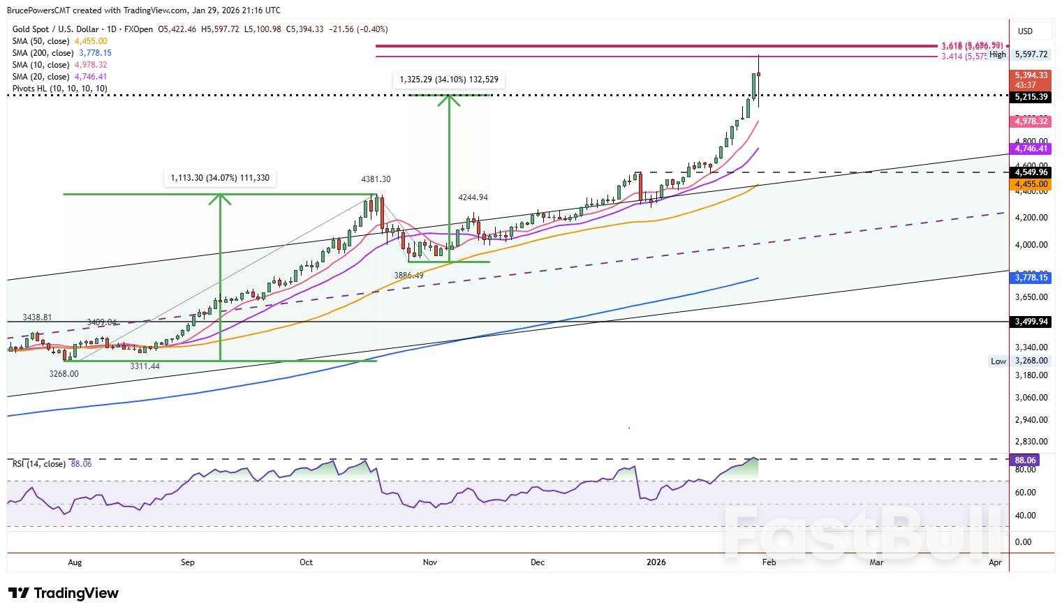 A bearish outside day triggered in gold on Thursday, setting the stage for a possible pullback to lower prices or consolidation. The precious metal is set to have its first down day in nine days and end the pattern of higher daily lows that partially defines the short-term uptrend. Thursday's session began with a breakout to a new record high of $5,598, before sellers took back control and drove the price below Thursday's low to $5,101.