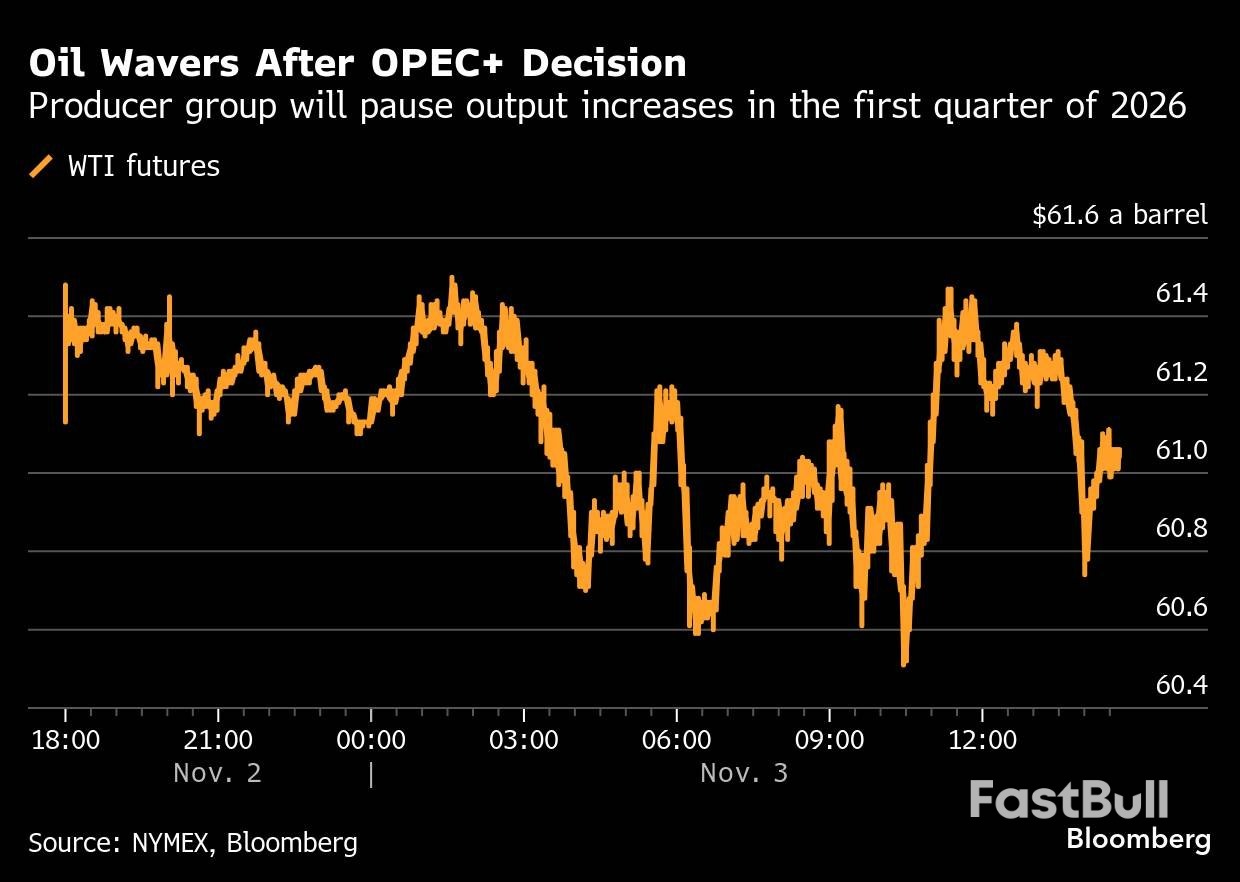 West Texas Intermediate rose about 0.1% to settle above $61 a barrel after fluctuating between small gains and losses through the day, extending a string of marginal increases. The Organization of the Petroleum Exporting Countries and its partners said the decision on Sunday to halt production hikes from January reflects an expectation for a seasonal slowdown. The move comes against a backdrop of widespread forecasts for excess supplies next year that could weigh down prices.