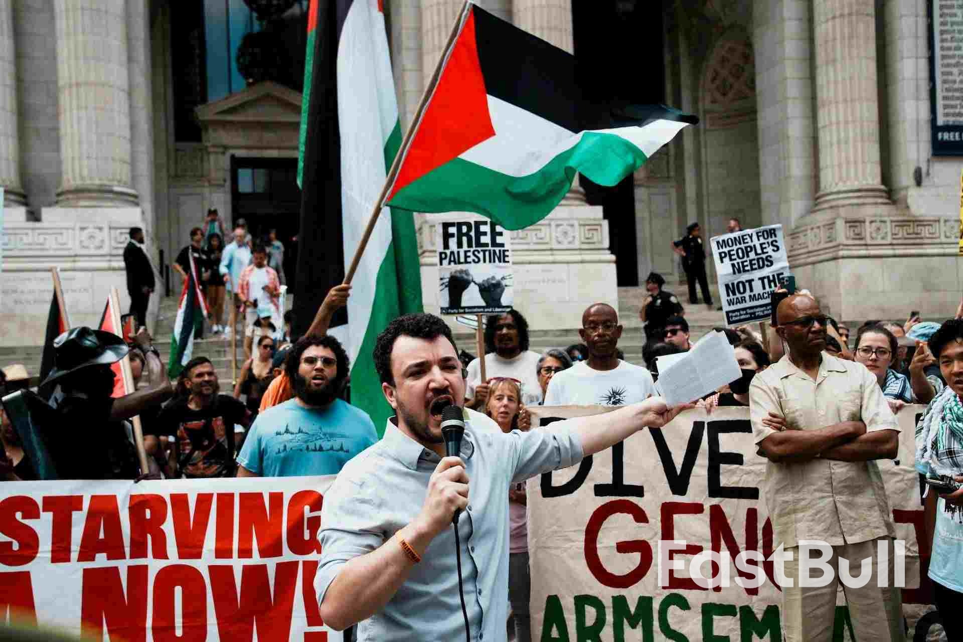 Mahmoud Khalil speaks to people as they gather at Bryant Park, to participate in a "Stop starving Gaza" march during the ongoing conflict between Israel and Hamas, in New York City, U.S., August 16, 2025. REUTERS/Eduardo Munoz